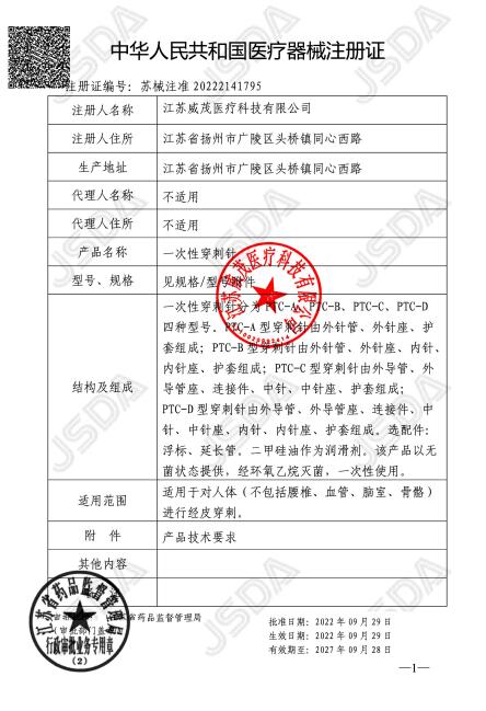 一次性穿刺针分为PTC-A、PTC-B、PTC-C、PTC-D四种型号。PTC-A型穿刺针由外针管、外针座、护套组成;PTC-B型穿刺针由外针管、外针座、内针、内针座、护套组成;PTC-C型穿刺针由外导管、外导管座、连接件、中针、中针座、护套组成; PTC-D型穿刺针由外导管、外导管座、连接件、中针、中针座、内针、内针座、护套组成。选配件:浮标、延长管。二甲硅油作为润滑剂。该产品以无菌状态提供,经环氧乙烷灭菌,一次性使用