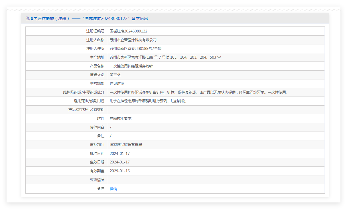 一次性使用神经阻滞穿刺针由针座、针管、保护套组成。该产品以无菌状态提供,经环氧乙烷灭菌。一次性使用。用于在神经阻滞局部麻醉时进行穿刺、注射药物。
