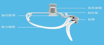 止血压迫器由基座(陶氏DOW聚碳酸酯)、底部(陶氏DOW聚碳酸酯)、旋钮(丙烯酸树脂)、维可牢带(尼龙)、热缩管(聚酯纤维)组成。一次性使用,环氧乙烷灭菌。