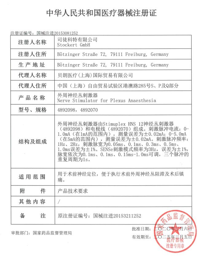 结构及组成/主要组成成分外周神经丛刺激器由Stimuplex HNS 12神经丛刺激器(4892098)和电极线(4892070)组成。刺激脉冲电流:0-1.0mA(在1mA的范围内),测量误差为±0.02mA;0-5.0mA(在5mA的范围内),测量误差为±0.02mA。刺激脉冲频率:1Hz、2Hz,刺激脉宽为0.05ms、0.1ms、0.3ms、0.5ms、1.0ms误差为±1%。SENSe刺激模式频率为3Hz,误差为±1%,脉宽依次为0.1ms、0.1ms、0.15ms-1.0ms可调,三个脉冲的重复周期为1s。